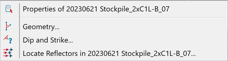See Register Group Overview > Locating Reflectors for more information on locating reflectors. See Dip and Strike > Query for information on the Dip an Strike... option. You can find information on the other options under Menus and Tools > Query. |
