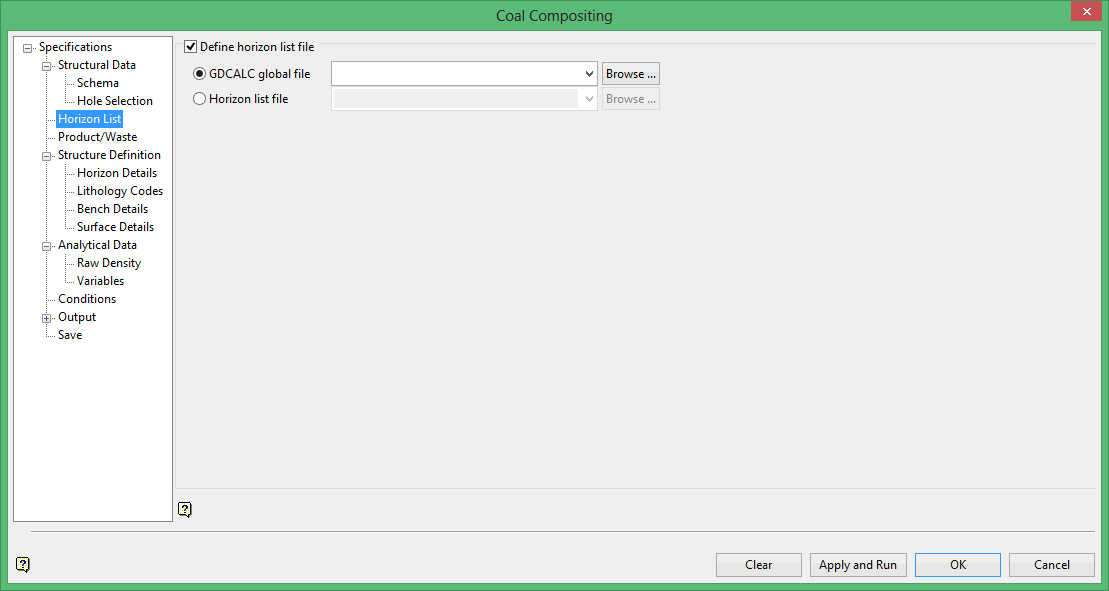 Select this option to use the horizon list contained in an existing GDCALC global file (.gdc_glob). The drop-down list contains all.gdc_global files found in you current working directory. Click Browse to select a file from another location.