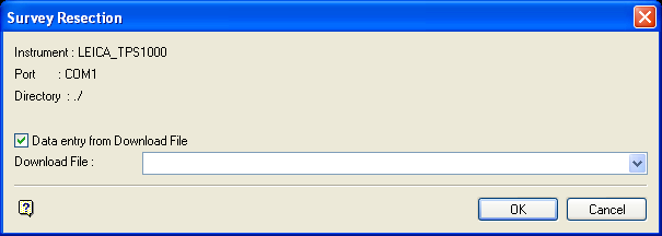 Select this check box if the resection data is to come from a specific GEODAT download file. If this check box is checked, then you will need to supply the download file name. The necessary file can either be entered manually, or selected from the drop-down list.