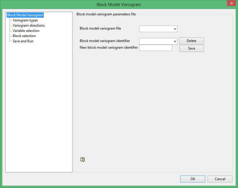 This section allows you to define, copy and delete the Block Model Variogram specification file (.var) and parameter identifiers. - Variogram types