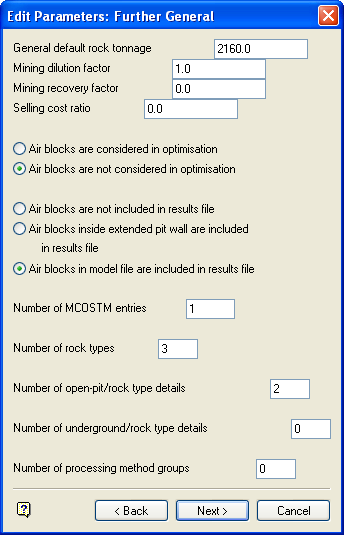 Note: The Edit Parameters: Underground Processing panel, which contains the same fields as the Edit Parameters: Open Pit Processing panel, is only displayed if one or more underground combinations are specified on the Further General panel. |