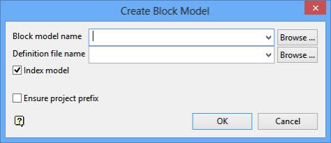 Select Ensure project prefix to use the project code as a prefix when naming the resulting block model. If this check box is checked, then the full name of the resulting block model will be <proj><name>.bmf.