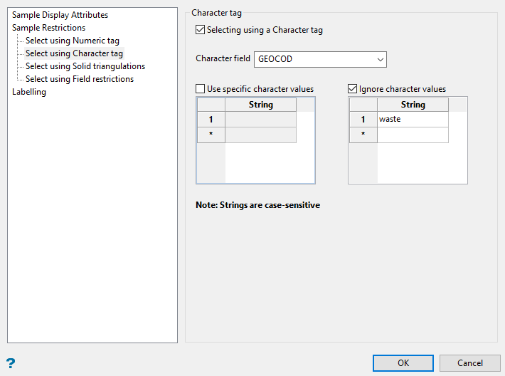 In the image above, our database is populated with four GEOCOD values: TQ1, TQ2, TQ3, and WASTE. We have opted to include all values except those samples which have a value as WASTE. Any sample that contains a GEOCOD value of WASTE will be excluded from our sample population.