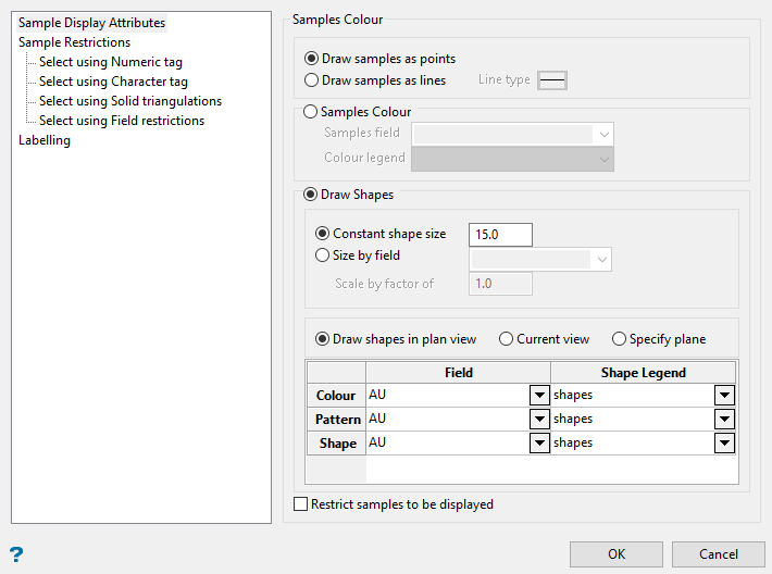 Draw Shapes will apply shapes to the samples instead of using points or lines. The colour and style of the shapes will be based on the SHAPE legend selected.