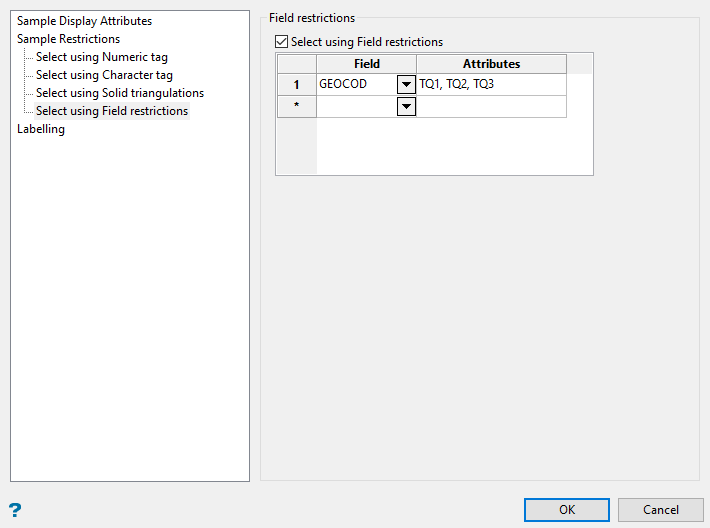 Select this checkbox to limit the samples to those with fields that match certain selection criteria. Select a Field from the drop-down list and enter applicable selection criteria in the Attributes column.