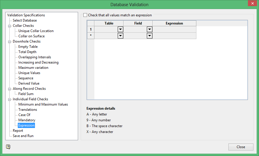 This test compares the format of the selected Field to an entered Expression. The allowable expression items are: