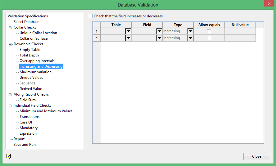 Select a Table(s) and associated Field(s), and choose whether subsequent logged intervals should be Increasing or Decreasing. Decide whether the fields can be equal, and enter any Null value to ignore.