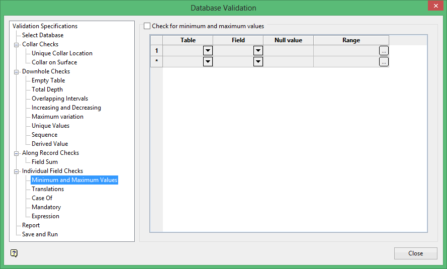 button to define an acceptable Range of values in the chosen Field. An entered Null value is ignored during analysis.