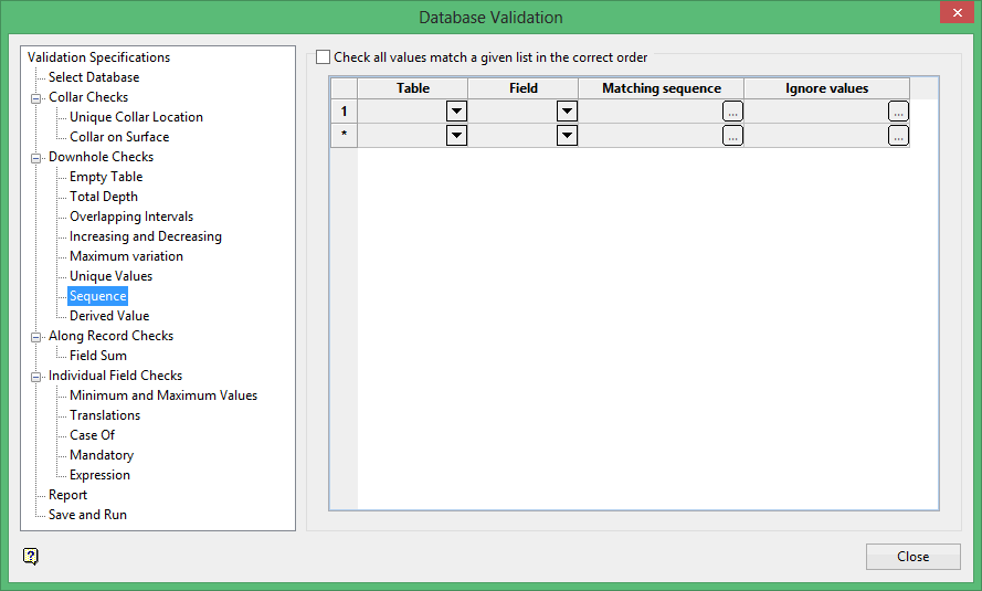 This check produces errors if values in a selected field do not match the defined sequence of alphanumeric values. This could be used for checking a horizon list, but there are better options available for checking horizon continuity, such as Geology > Drilling Utilities > Check Drillholes. If required, enter values to ignore.