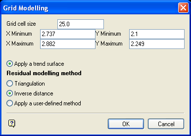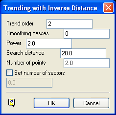 The mathematical method used is a regression method that gives the best fit. In the same manner that you can plot a scatter diagram and work out a line of best fit, you can add an extra variable (For example, easting or northing) and compute a 3D surface of best fit. The fitted surface represents the regional trend present in the data. This trend surface will pass through the data as a surface of best fit. The data necessary to apply trending is specified through a separate panel. This panel is accessed upon completion of the current panel.