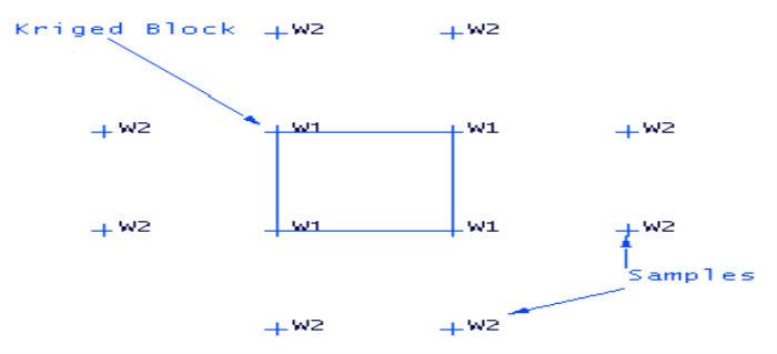 When there is no nugget effect, the weights associated with the closest samples to the block are greatest. The corner samples screen the panel from the influence of the exterior samples (that is, Screen Effect). The influence of more distant samples is therefore significantly reduced by the screen, this has the effect of virtually assigning the grade of the panel to the weighted grade of the four corner assays. In these circumstances, a considerable saving is achieved in kriging calculation by considering only the assays in or at the edge of the panel.