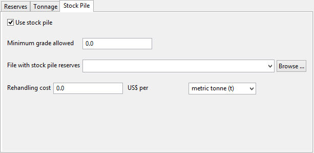 Use the Stock Pile tab to define the use of stock piles during the optimisation process.