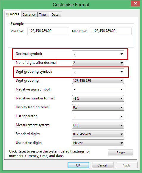 To ensure correct results, you should verify that your number format settings in your Windows configuration settings are correct. Some number format settings for languages other than English may default to different symbols for decimals and thousands separators. To check your Windows settings, go to Control Panel > Region and Language > Formats > Additional settings. The Decimal symbol should be a full stop/period (.) and the Digit grouping symbol should be a comma (.). Therefore, the correct number format should be 123,456,789.00.