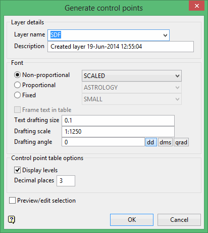 The Control Points option to set annotated control points and generate a control points table. Control points can be used as absolute or relative reference points for design work, even though the points themselves are not to be included, for example newly digitised data can be precisely positioned with respect to control points whose positions have been accurately surveyed.