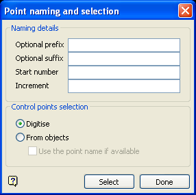 Cancel with the mouse when you are ready to return to the Point naming and selection panel. Press the Done button when you are ready to create the control points table.