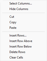 The panel utilises grid controls to manage the grid information, i.e. right-click context menus, that allow you to perform options such as hiding columns, cutting, copying, and pasting cells, and inserting and deleting rows. Right-click in the grid area to display the context menu. Descriptions of the available options are listed below.