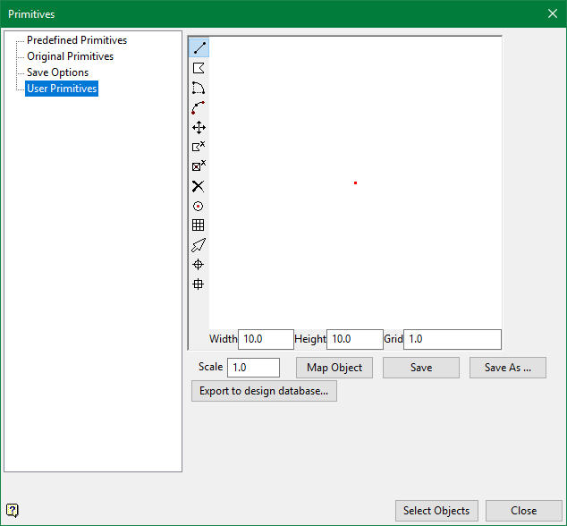 Use the Select Objects button to assign a chosen primitive, and the Close button to exit the Primitives interface. The Select Objects button will be disabled when using the Save Options section of the Primitives interface.