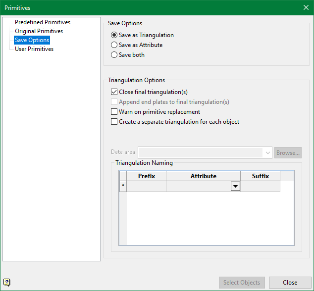 Specify whether the primitive is to be saved as a triangulation, an attribute or both. The Save Triangulation panel displays when using the Save as Triangulation and Save both options.