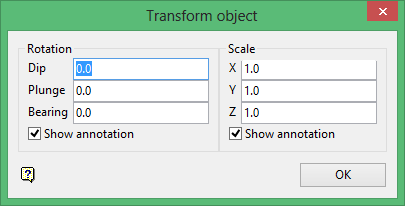 Use the Transform option to transform an object or objects interactively. The objects can be transformed by altering the bearing, plunge and dip of the X (Easting) axis relative to a user-defined origin (or centre of rotation), by translating the object or by scaling the object.