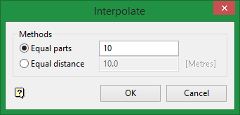 When using the equal distance option the distance is measured from the first point (in the digitised sequence) of the line segment. If the specified distance does not divide evenly into the length of the line segment, then the distance between the last inserted point and the end of the line segment will be less than the specified distance. For example, in Diagram 3 above, the length of the line segment was 25m and the specified distance was 10m, the length between points 4 (last inserted point) and 5 (end point of the segment) is 5m.