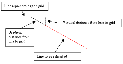 A line can be relimited against a grid mesh that has been displayed (using the Load option under the Model > Grid Mesh Surfaces submenu or selecting the List Grids button from the Open toolbar) in two ways:
