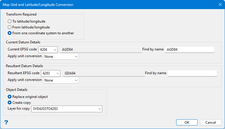Note: This option uses Redfearns Formulae to perform a direct conversion of the coordinates. Both AMG and ISG are based on the same spheroid, which means that you can convert freely from AMG to ISG. However, this option does not convert from AMG or ISG to MGA. Use the GDA Conversion option to convert AMG of ISG to MGA.
