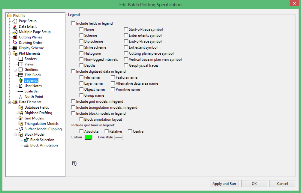Use this section to specify which items to include in the legend. In most cases you will not need to alter the panel defaults. If you have not specified one or more data elements, then the corresponding legend entries will not be displayed.