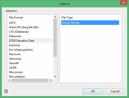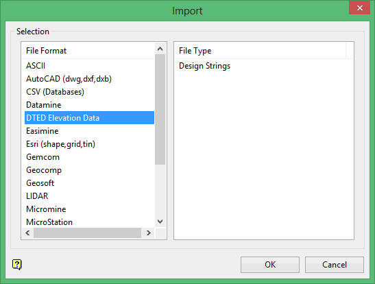 Use this option to import data from a Digital Terrain Elevation Data (DTED) file. You can use Vulcan to import the information from a DTED file, including latitude, latitude, and elevation point data. You can also convert the data to a different coordinate system and display or transfer the data to a file.