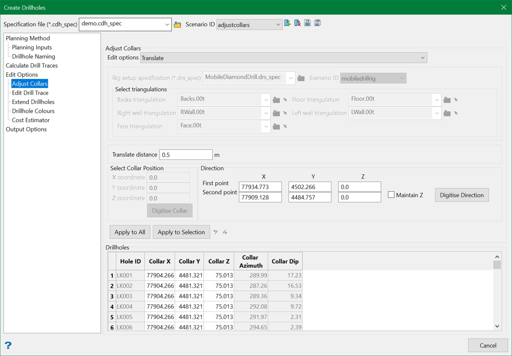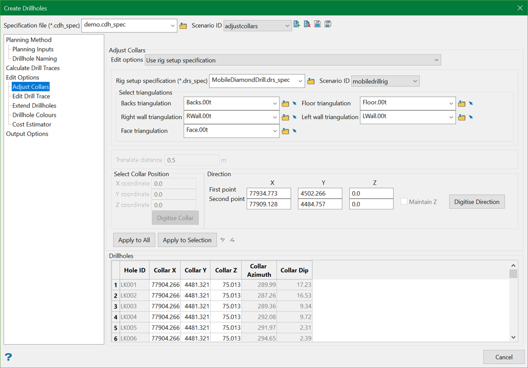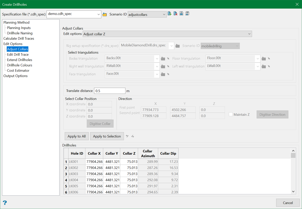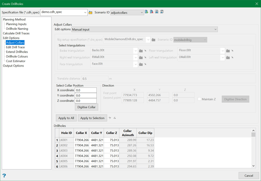 When drillholes have been created from planning design data, such as a drive centreline, the final collar positions of the drillholes may need to be adjusted to account for things like the drill rig setup constraints or other potential hazards.