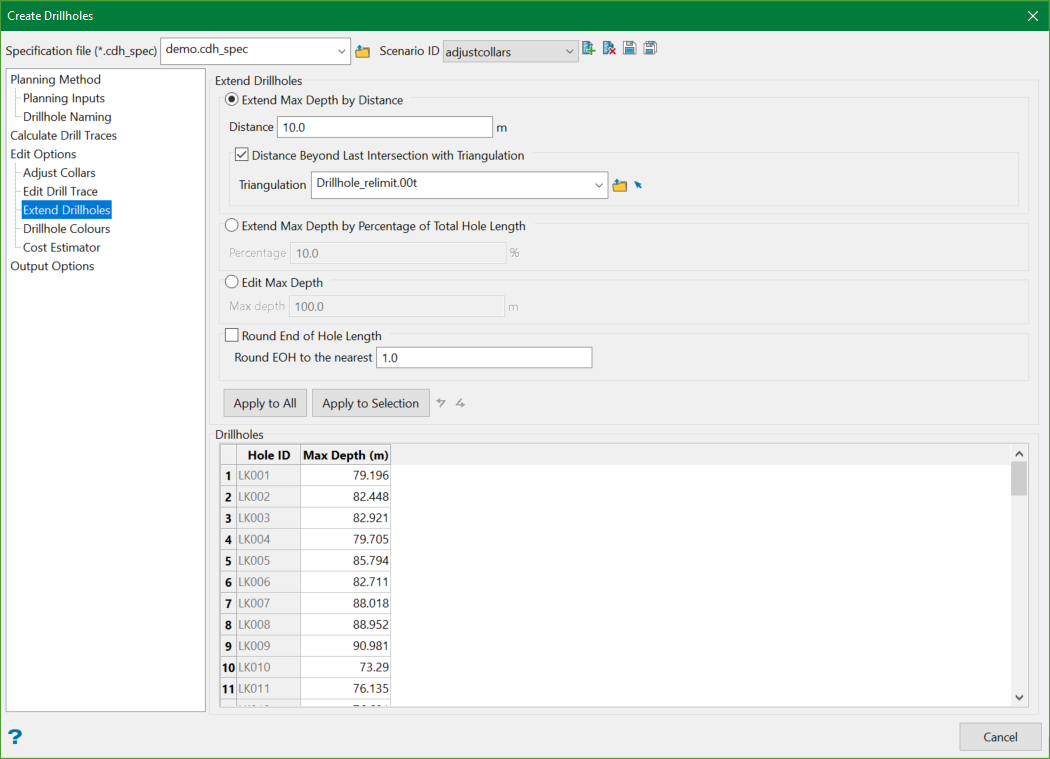 Extensions can be applied to all drillholes using the Apply to All button or to those currently selected in the grid by using the Apply to Selection button.