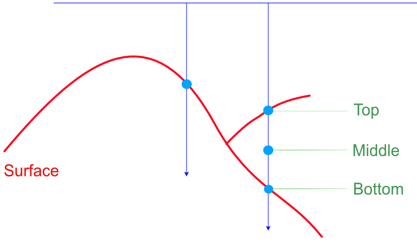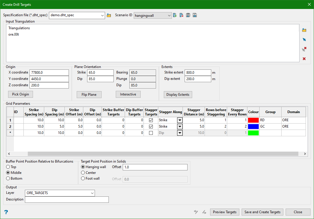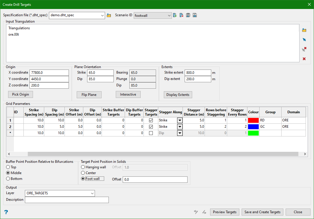 Targets within solids can be created on the hanging wall, foot wall, or in the centre of the solid. An offset distance can be specified to offset the points from the hanging wall or foot wall. Positive offset values offset inside the solid while negative values offset outside of the solid.