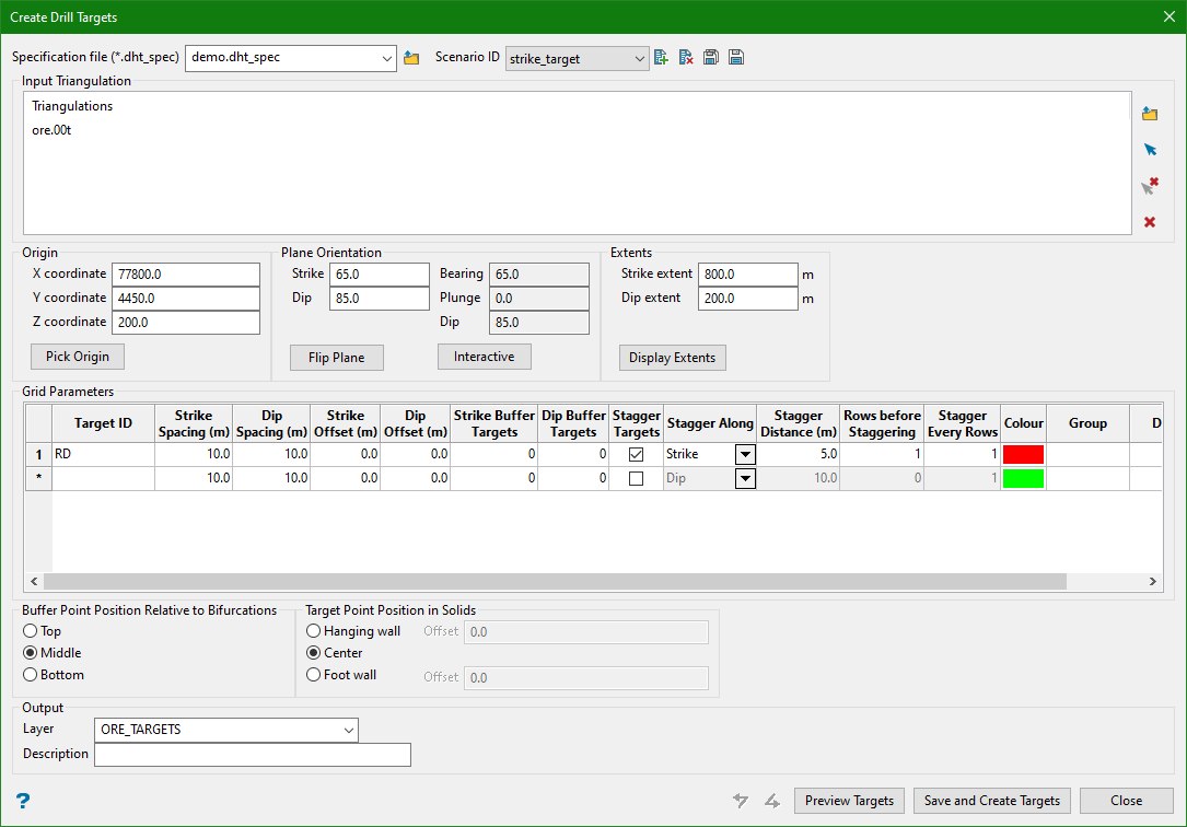 Use this tool to quickly and easily create drilling target points within a triangulation based on user-defined grid spacings. These target points can later be used as input to creating drillholes.