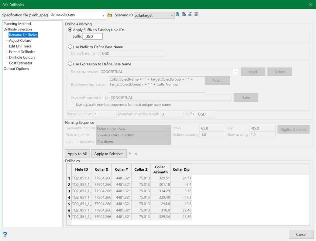 This section defines the renaming convention and sequence that can be applied to the drillholes that are selected. The flexibility in drillhole naming convention has been incorporated to fit in with short term, production drilling programs as well as long term, life of mine programs.