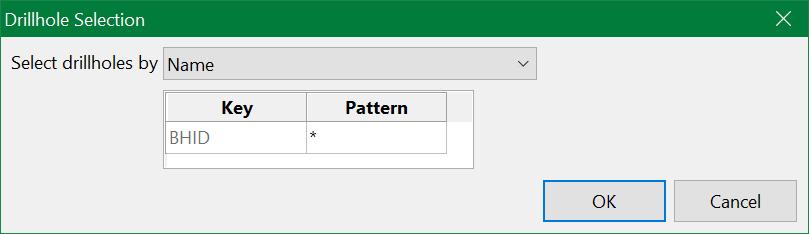 UGDis used for all underground drillholes in the database and only these drillholes were to be used in the calculation, thenUGD*could be input as the Pattern. The default*is used as a wildcard to select all drillholes in the database.