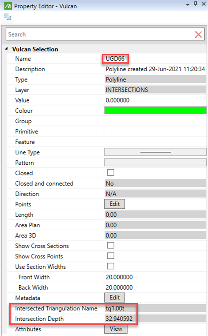 The objects (points) created will be named according to the drillhole name. The name of the intersection triangulation and the downhole depth of the intersection get stored in metadata attributes.