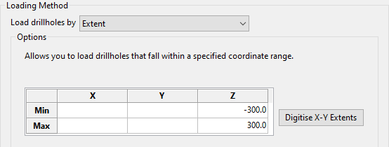 Note: Alternatively, to digitise a region on your screen in which drillholes are loaded, click Digitise X-Y Extents. The Z-values for this region must be manually configured in the Load Drillholes panel.
