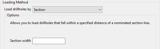 Enter the section width. This value refers to the distance in which the drillhole collar must fall in order to be selected. The selected section line lies in the middle of the specified width, i.e. a section width of 20.0 results in the loading of all drillholes that fall in 10.0 metres of either side of the section line..