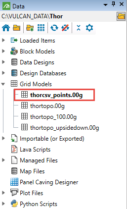 Full name with extension added so that the file is displayed in the Grid Models section of the Vulcan Explorer: thorcsv_points.00g