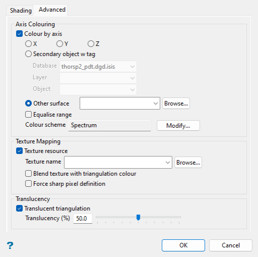 Select the Colour by axis checkbox to colour the triangulation by its X, Y, or Z-axis, by the W tag of a secondary object, or by the Z-axis of another surface (i.e. a triangulation or grid).