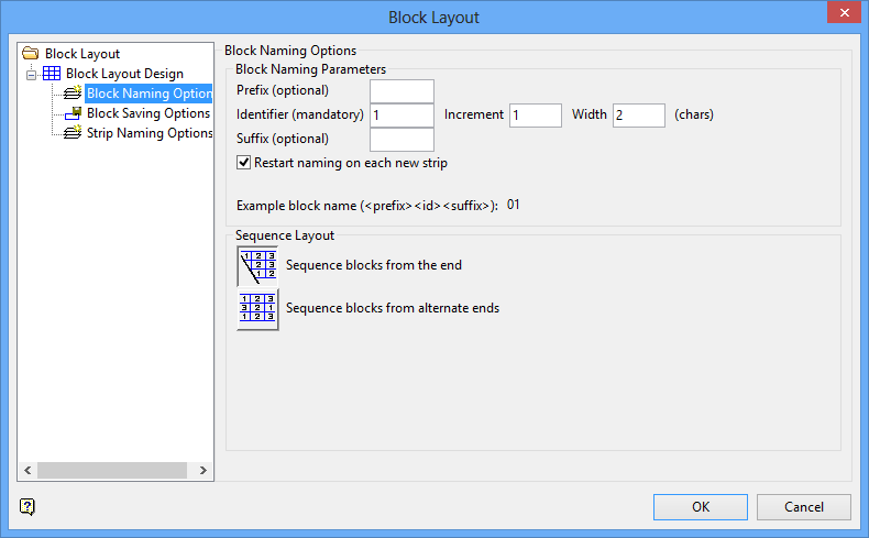Enter the number of characters in width the identifier field needs to be. By default, the width is set at 2 characters wide. With an increment set at 1, this allows a total of 99 blocks (01 through 99).