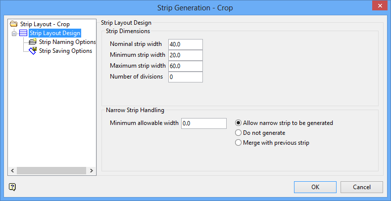 Enter the minimum allowable width. Strips less than the specified area will not be created. Use the default value of '0.0' if you don't want to apply a restriction. Select how you want strips which violate the minimum allowable width parameters to be treated: