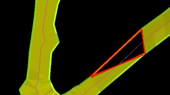 The as-built triangulation has been built from the data created by the Generate option, but when checking the triangulation with the Model > Triangle Utility > Check option, the consistency and possibly other options checked on the tests are failing. When creating the as-built triangulation with the Build 3D Drive option, you chose to create bevels at the corners of the as-built.
