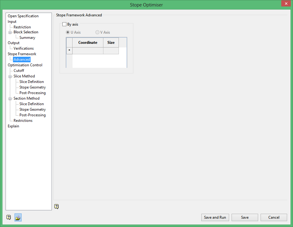 On the Underground menu, point to Analyse, click Stope Optimiser, and then select Stope Framework > Advanced from the tree menu on the left to display the Advanced panel.