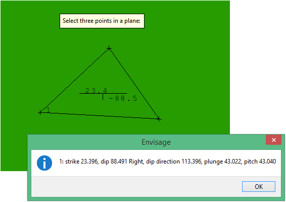 Select three points to define the plane of which you want to know the strike, dip and plunge. The first two points define the bearing and the third the dip. The points are shown graphically as an underlay. The strike, dip, dip direction, plunge, and pitch are displayed in a standard Vulcan text window.
