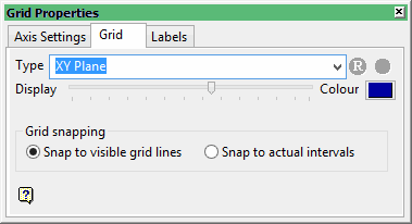 Use the Apply option to display a grid. You can specify the type of grid; XY Plane, XZ Plane, YZ Plane, Screen Plane, Primary Plane and 3D; the colour and the opacity of the grid display (that is, how solid the grid appears on the screen); whether to snap to visible grid lines or to the actual intervals; the origin and step size for the grid; and whether to label the grid.