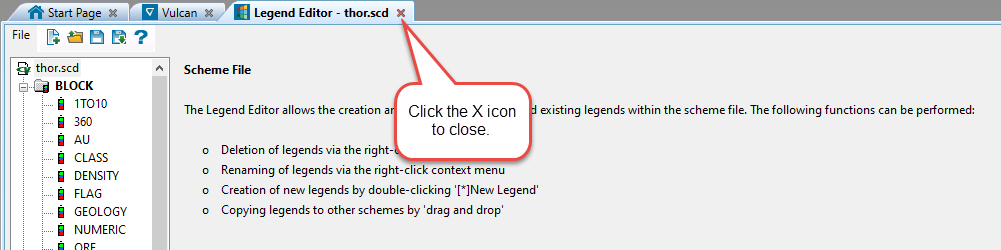 Note: Â The Legend Editor can also be accessed from the Workbench Start Page under the Tools section, or by right-clicking on an existing colour scheme file (.scd) in the Specification folder of Vulcan Explorer and selecting Open with Legend Editor from the context menu.