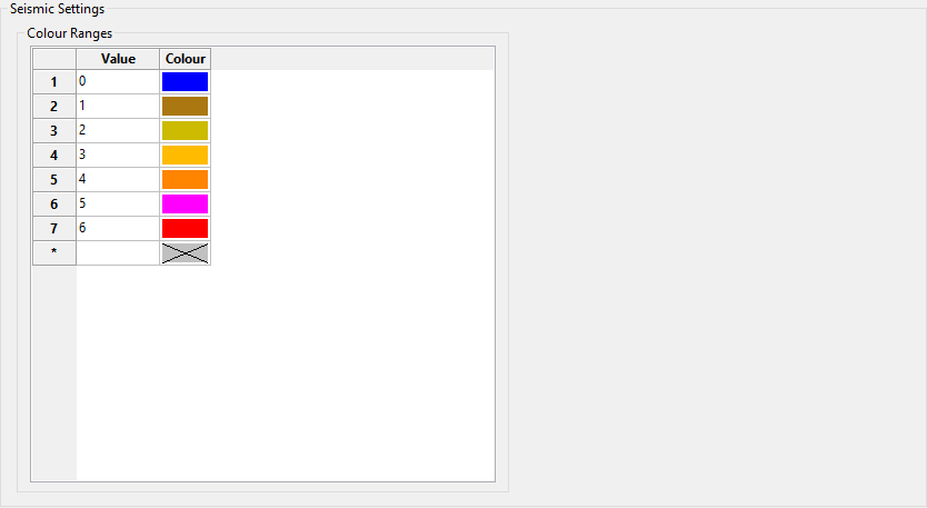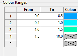 Select a colour for each value in the Colour Ranges table. To set colours automatically, right-click on the Colour column header, select Colour Range from the context menu, and choose the start colour and, optionally, the end colour from the palette to generate a range of colours in the table. To set colours individually, double-click the Colour field by each value and select from the palette.