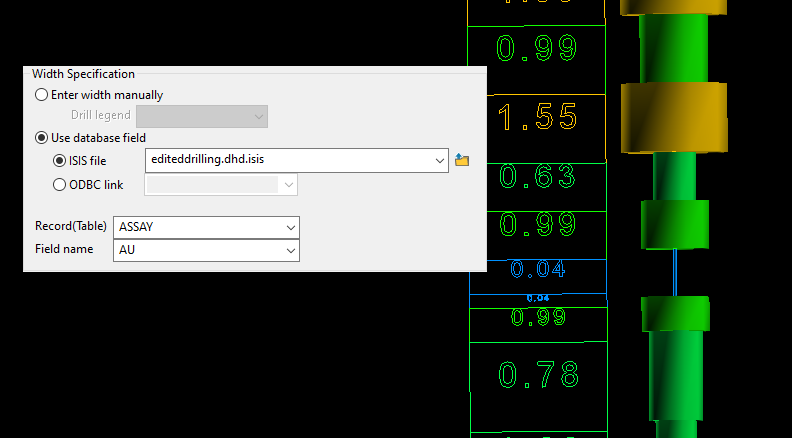 ExampleIn this case, the disc widths were set to the value found in the assay grade of the drillhole database.