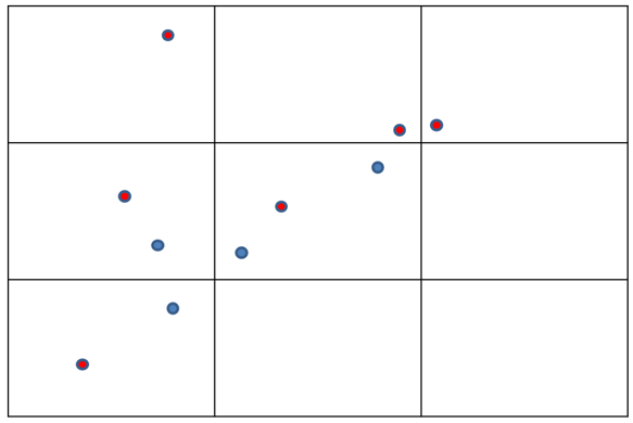 Figure 1: In this example, the red points are the closest to each centroid and therefore are a match.