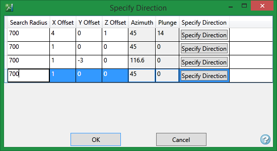 The following panel is displayed when the Specify Directions Grid button is clicked while setting up the parameters for multi-direction variograms of a block model.